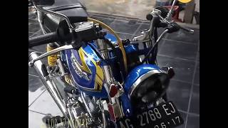 GL 100, CDI Supra, Velg 18x1.60 DID, Ban Depan Belakang Swalow wiro ukuran 400, stang menggunakan stang minor fighter, lampu mobil, tengki bensin custom, rangka total dirubah 80%, arm custom...